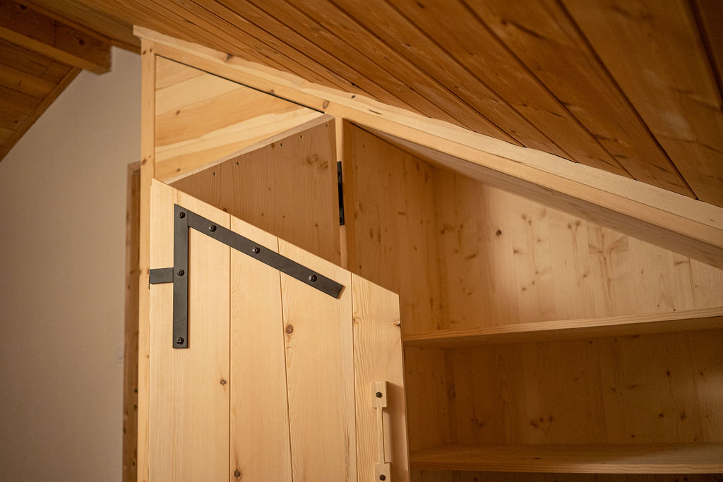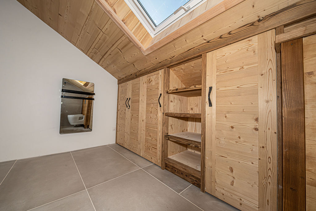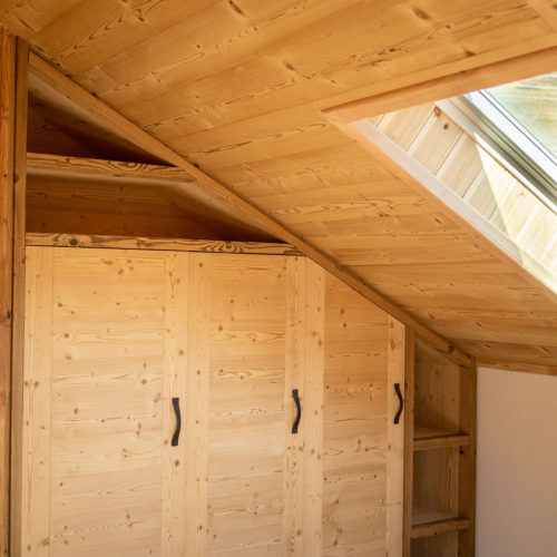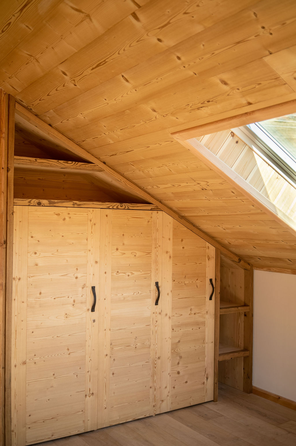 Conception réalisation du mobilier (chambres et salle de bain) d’un chalet de montagne. Les portes extérieures sont conçues à partir d’un parement d’épicéa thermo à l’extérieur et de mélèze de pays côté intérieur.