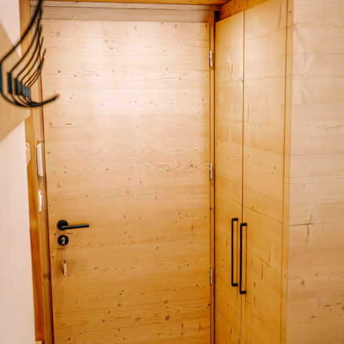 Les tables, mobilier de salles de bain, coffres, lits, armoires ; chacun des éléments s’accordent dans un esprit chalet cosy.