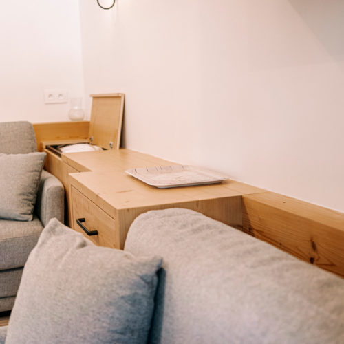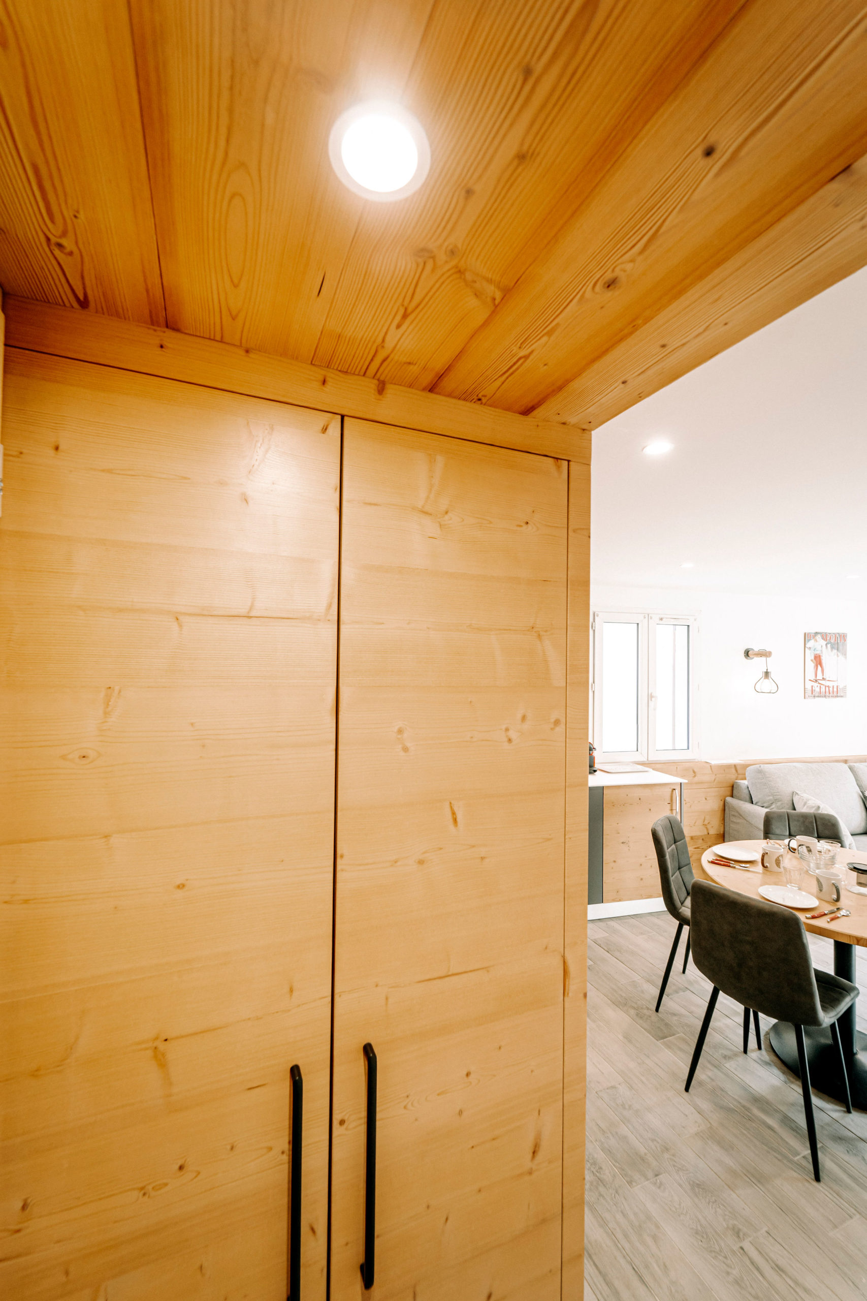 Le mobilier sur-mesure conçu en bois d’épicéa thermo chauffé, offre une optimisation des espaces et des rangements astucieux.
